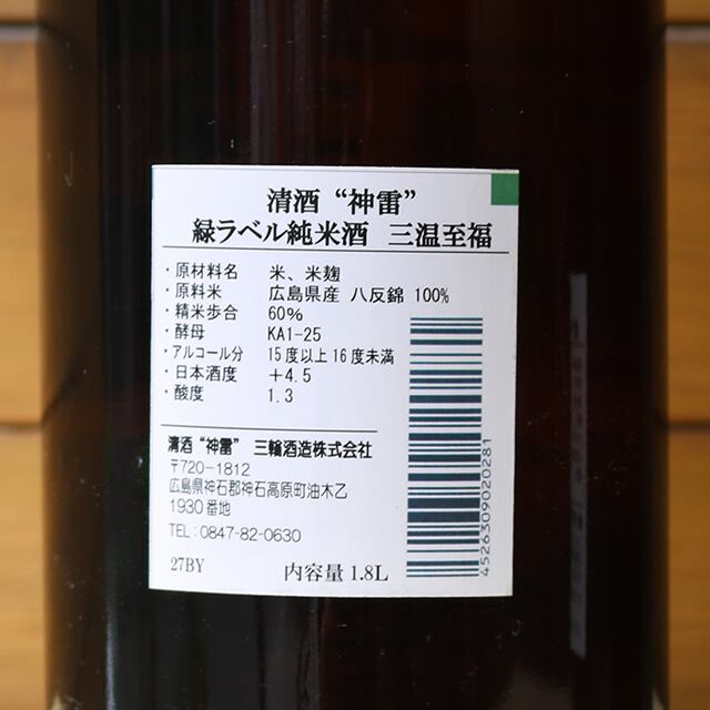 神雷(しんらい) 緑ラベル 三温至福 純米 1800ml 【広島】